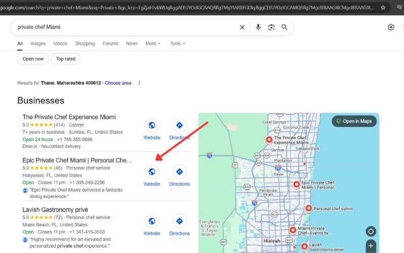 When someone searches for a private chef in Miami, Google often shows a local map pack at the top of the results. This section highlights three business listings before any organic website links appear. Ranking in this map pack drives direct calls and enquiries.